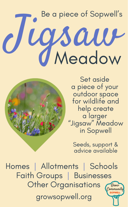 Small as a window box, large as a garden – do you have some land to spare? Grow Community – Sopwell launch the Jigsaw Meadow project in March 2024 when they will ask you to spare a piece of land; window box or patio planter, so together we create a Jigsaw or wildlife ‘corridor’ across Sopwell.
